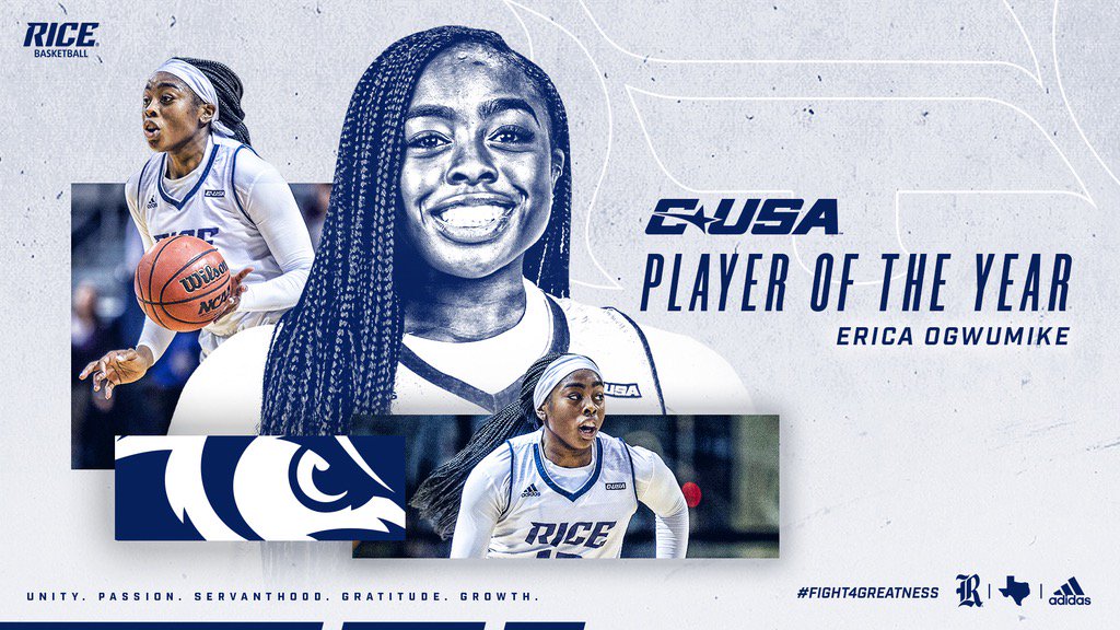 Erica Ogwumike won Conference USA Player of the Year as she led the Rice to Conference USA regular season and Conference Tournament titles. Erica averaged 16.5 PPG, 10.5 RPG, 2.7 APG, and 1.6 SPG in helping Rice to an undefeated conference play during the regular season. Ogwumike becomes Rice’s first Conference USA Women Basketball Player of the Year. Also, if you couldn’t tell Erica is the younger sister of Nneka and Chiney Ogwumike. The Ogwumike’s family is becoming a powerhouse in women basketball.